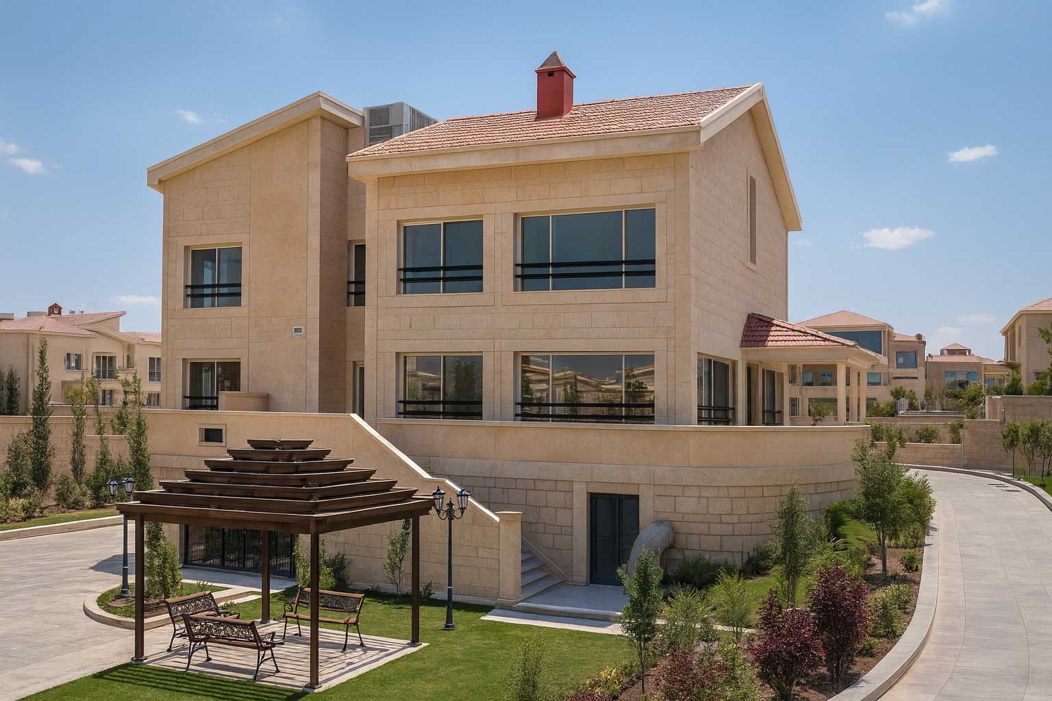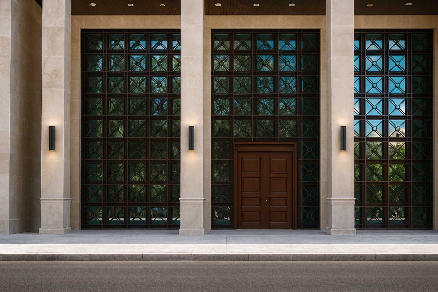 Real Stat Bank headquarters is designed as a dignified, contemporary civic façade that conveys permanence, security, and transparency. The entrance composition is organized around tall stone-clad piers that frame large…