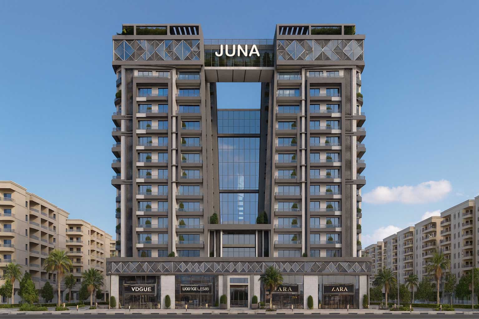 Juna Twin Tower is a mixed-use landmark composed of two slender residential towers rising above a continuous retail podium along a major urban boulevard. The architecture is defined by a…