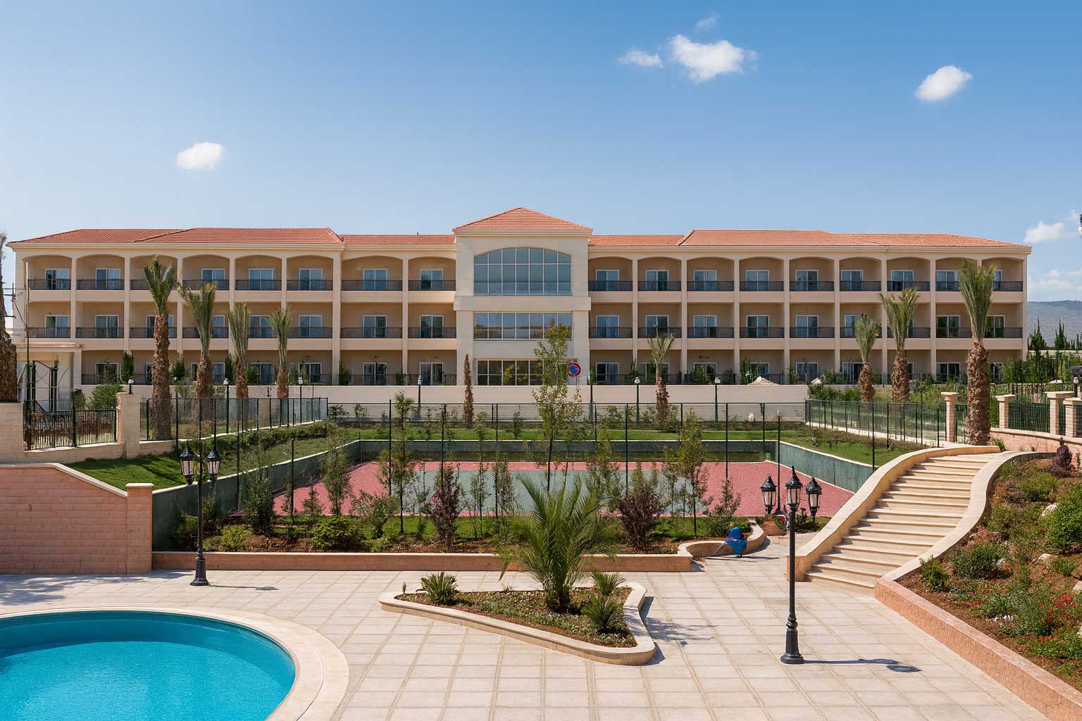 Palm Village is a resort-style hospitality complex designed around a linear three-storey hotel block overlooking landscaped gardens, a tennis court, and a central pool deck. The architecture combines warm Mediterranean…