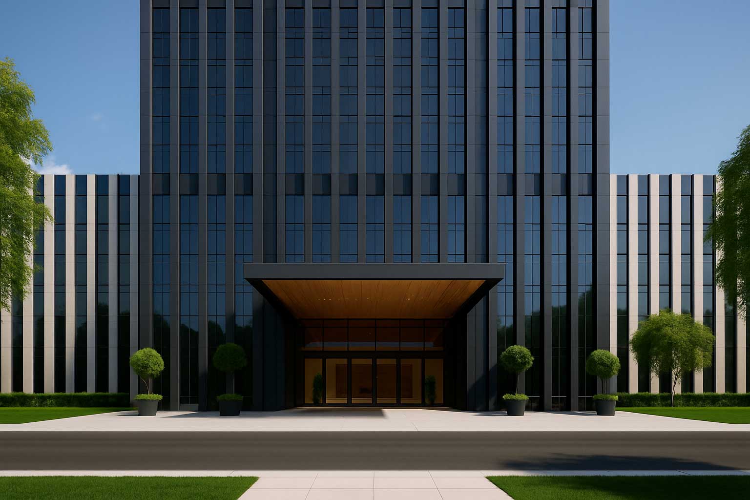 This hotel project is conceived as a sleek vertical landmark, combining a strong symmetrical composition with a refined corporate hospitality image. A central high-rise tower is flanked by two lower…