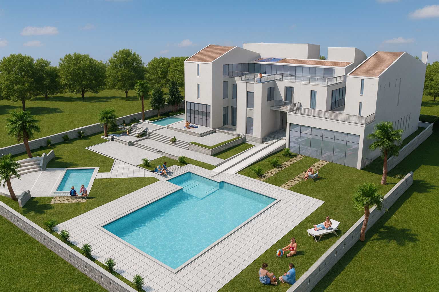 Jasmine Club is conceived as an exclusive leisure and hospitality retreat set in a generous green landscape. The main building is composed of interlocking white volumes and large glazed fronts…
