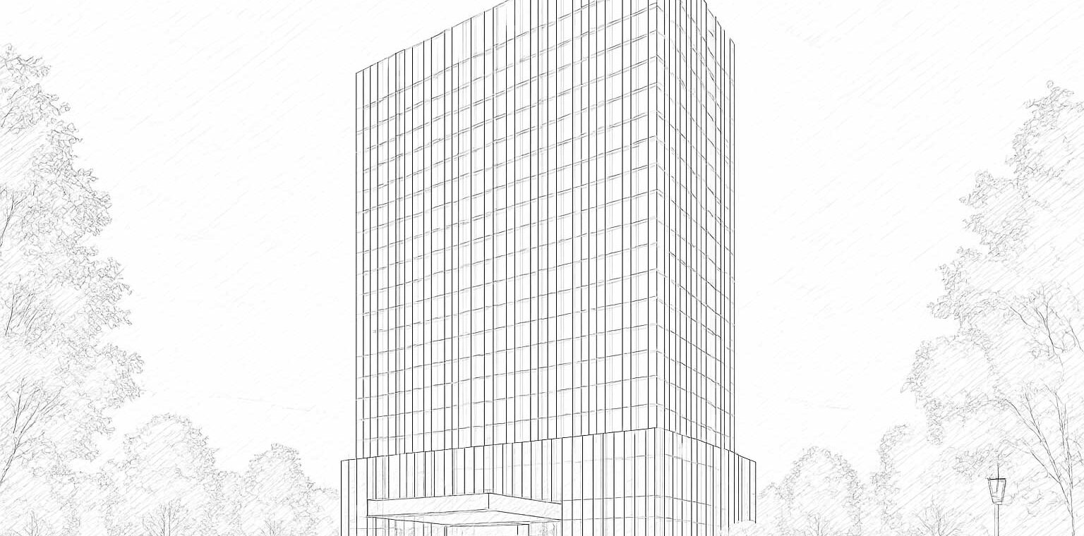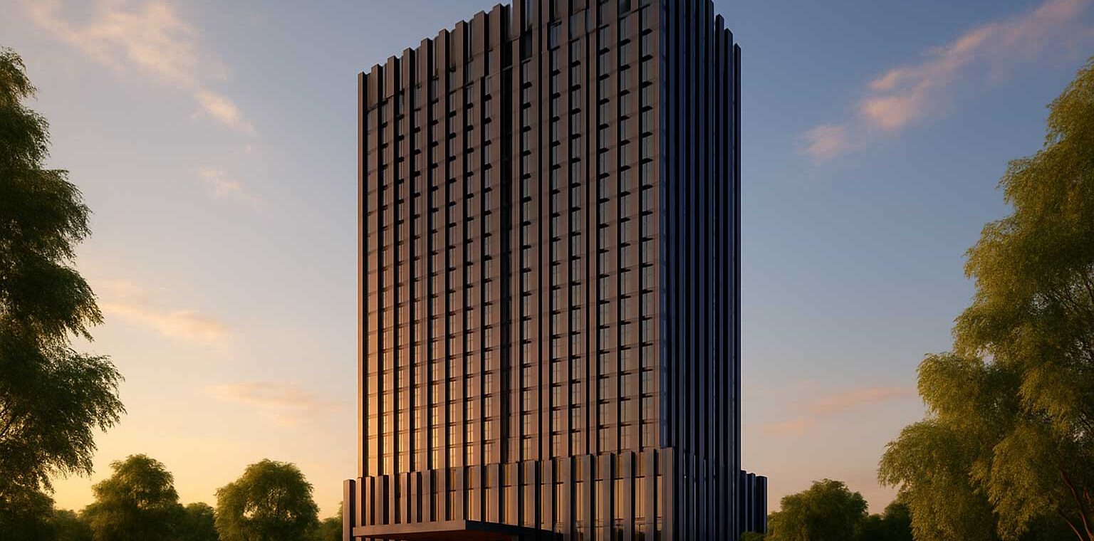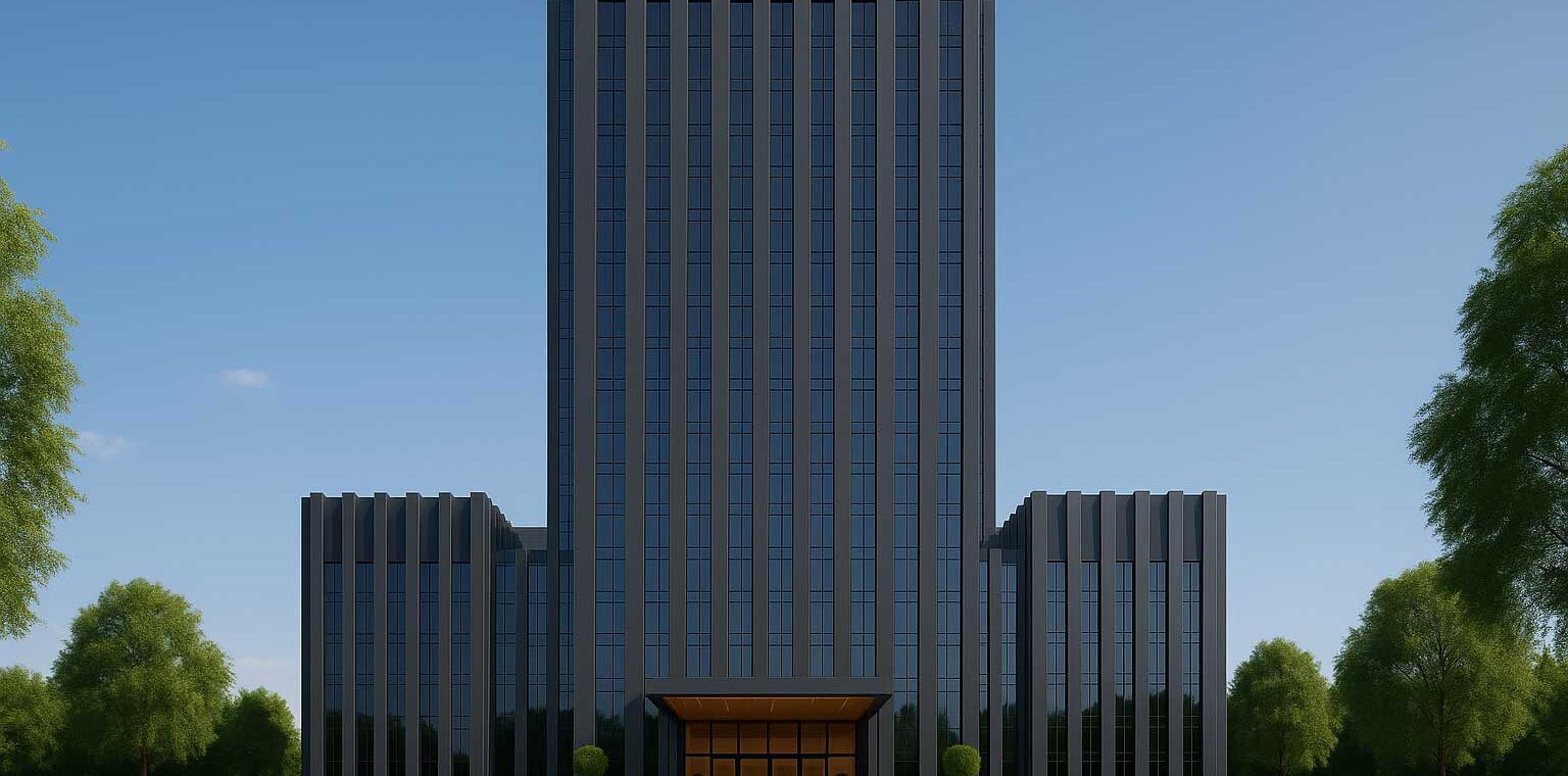This hotel project is conceived as a sleek vertical landmark, combining a strong symmetrical composition with a refined corporate hospitality image. A central high-rise tower is flanked by two lower wings, creating a clear hierarchy of volumes and allowing efficient separation of guest rooms, suites, and support functions. The façade is articulated with deep vertical fins and high-performance glazing, giving the building an elegant rhythm while improving shading, daylight control, and thermal performance.