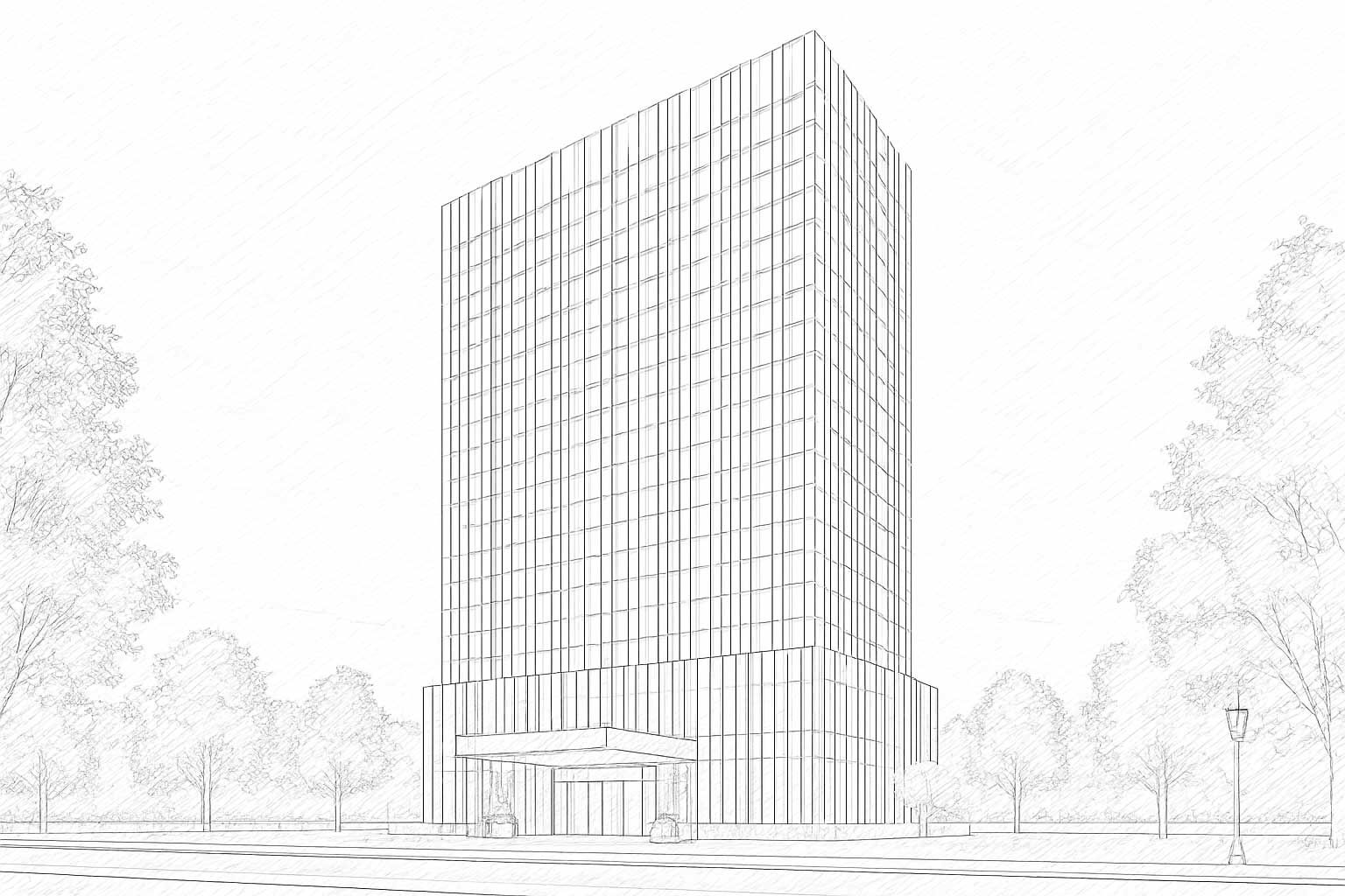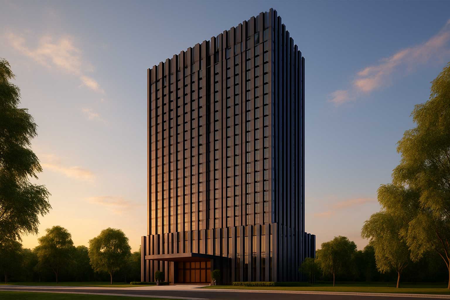 This hotel project is conceived as a sleek vertical landmark, combining a strong symmetrical composition with a refined corporate hospitality image. A central high-rise tower is flanked by two lower wings, creating a clear hierarchy of volumes and allowing efficient separation of guest rooms, suites, and support functions. The façade is articulated with deep vertical fins and high-performance glazing, giving the building an elegant rhythm while improving shading, daylight control, and thermal performance.
