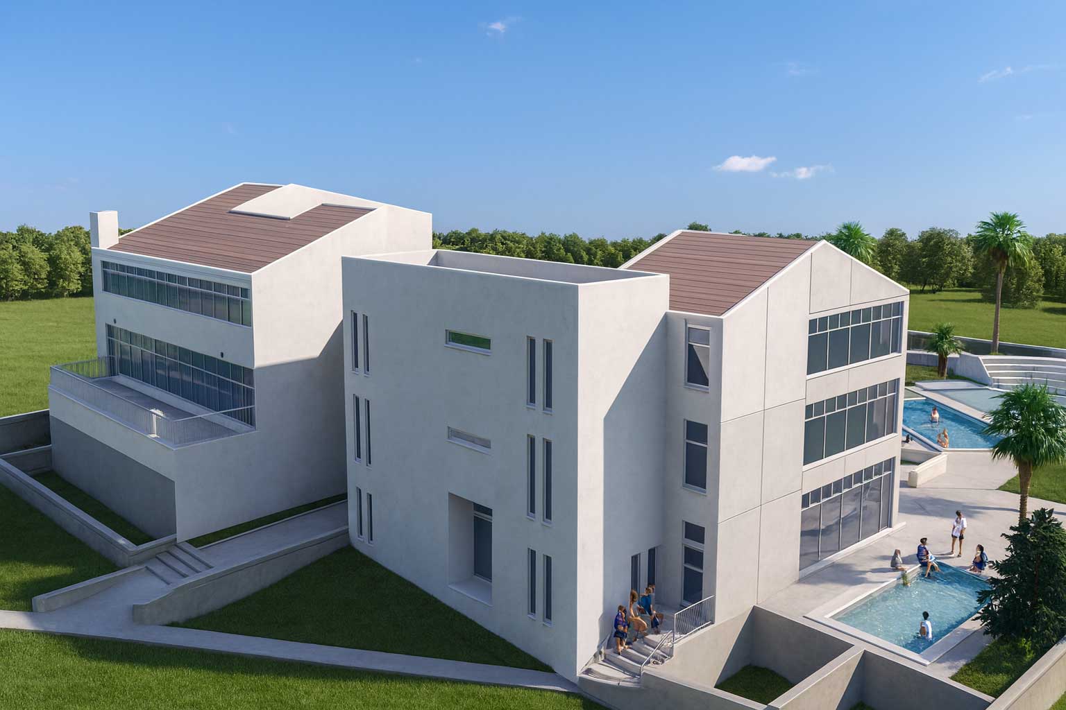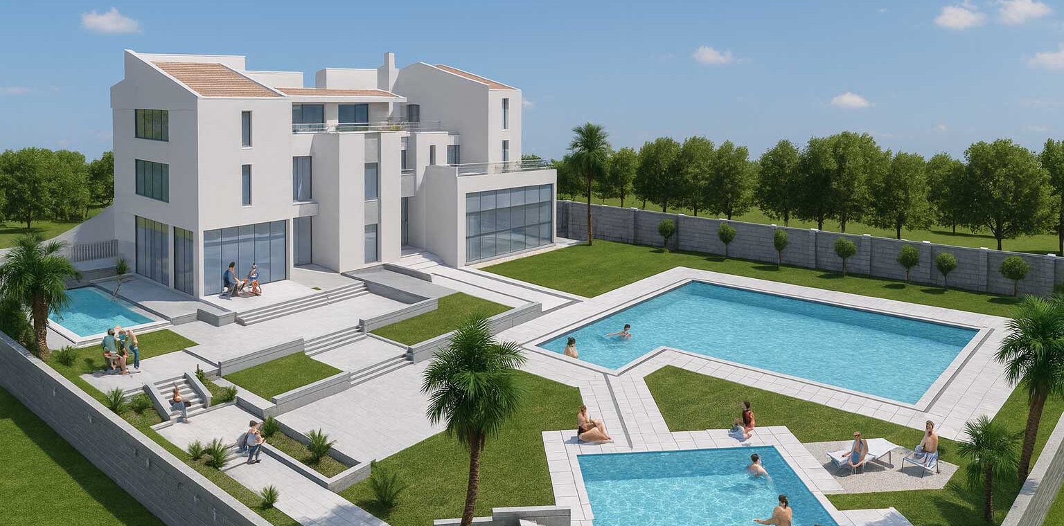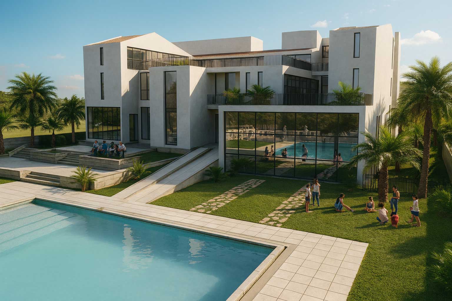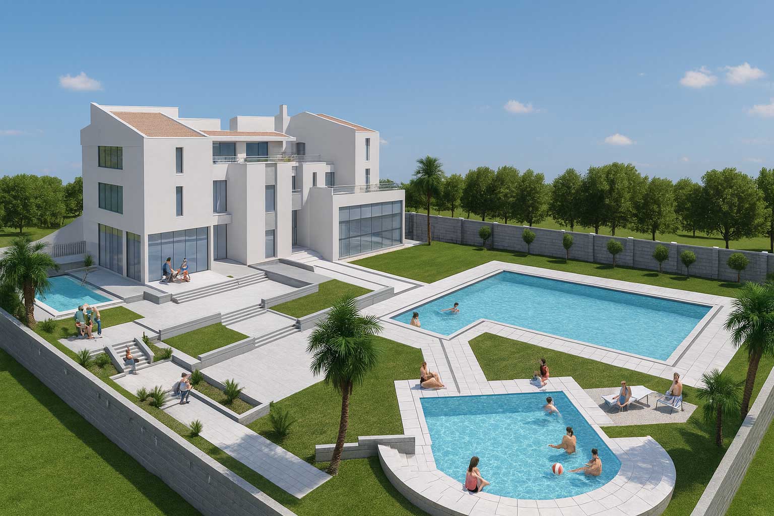 Jasmine Club is conceived as an exclusive leisure and hospitality retreat set in a generous green landscape. The main building is composed of interlocking white volumes and large glazed fronts that open fully toward a sequence of terraces, pools, and sun decks. The stepped platforms create a natural hierarchy of outdoor spaces, from intimate upper-level lounges to expansive poolside areas for families and events. Multiple water features, including a main lap pool, children’s pool, and shallow relaxation basins, are integrated with wide, slip-resistant paving and soft landscaped edges for comfort and safety.