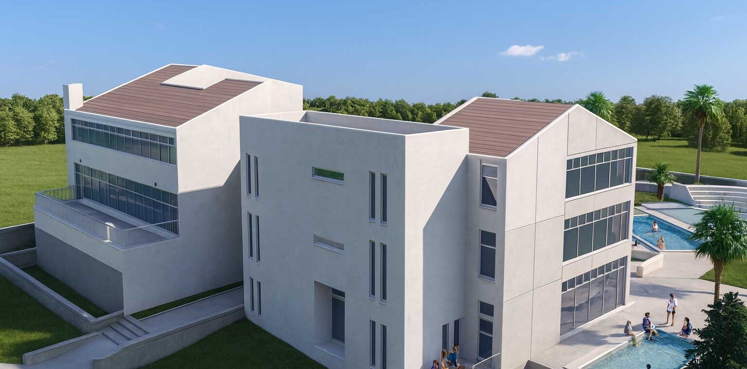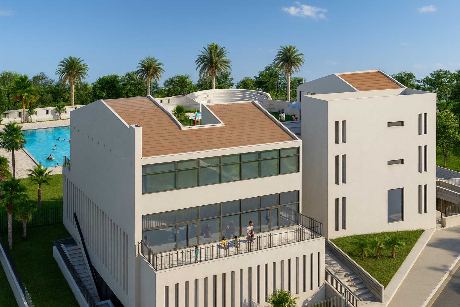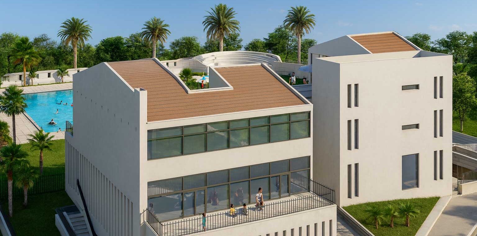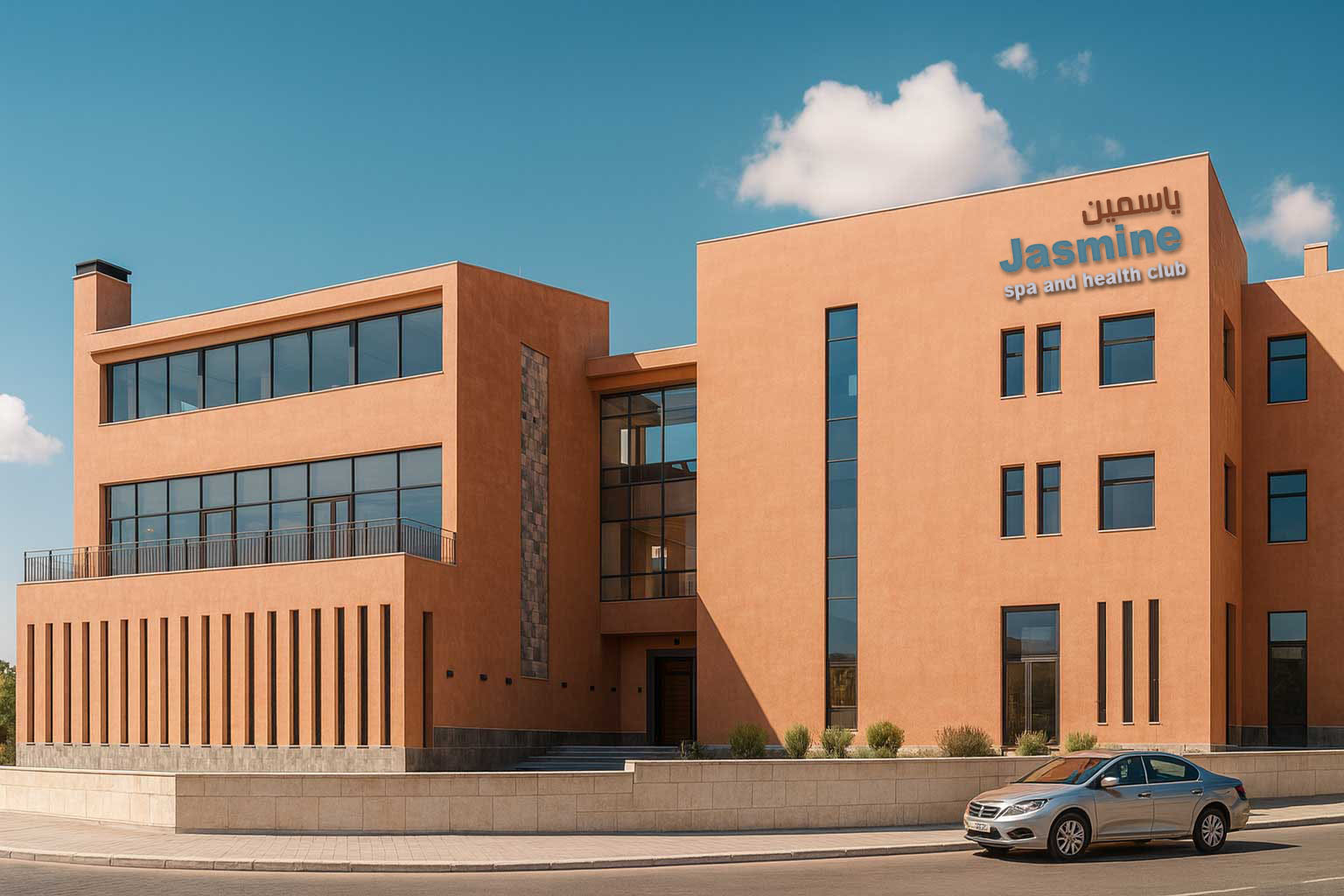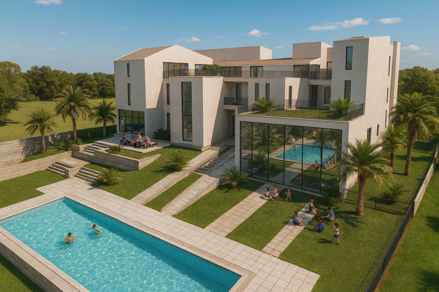 Jasmine Club is conceived as an exclusive leisure and hospitality retreat set in a generous green landscape. The main building is composed of interlocking white volumes and large glazed fronts that open fully toward a sequence of terraces, pools, and sun decks. The stepped platforms create a natural hierarchy of outdoor spaces, from intimate upper-level lounges to expansive poolside areas for families and events. Multiple water features, including a main lap pool, children’s pool, and shallow relaxation basins, are integrated with wide, slip-resistant paving and soft landscaped edges for comfort and safety.