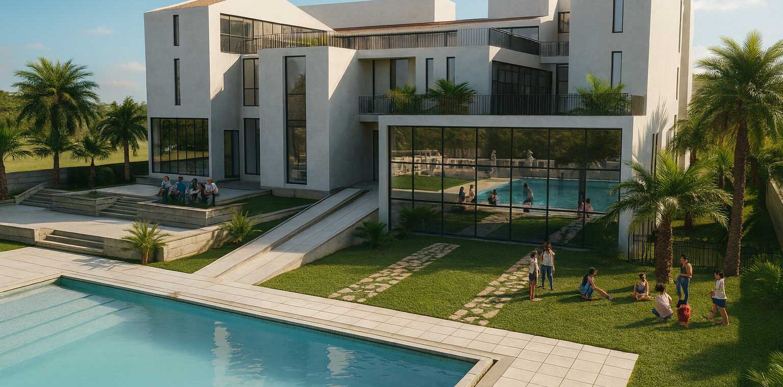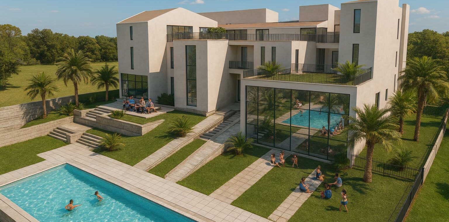 The architectural layout clearly separates service zones from guest areas while maintaining direct visual connections to the gardens from all interior lounges and suites. Roof orientations allow for solar panels and efficient technical plant placement without disturbing the clean contemporary silhouette. Housari Corp coordinated the club’s structural design with the complex retaining walls and terraces, and engineered the complete MEP package, including pool filtration, water treatment, irrigation, and outdoor lighting. The result is a resort-style club environment that combines modern architecture, functional planning, and high-quality outdoor amenities for year-round enjoyment.