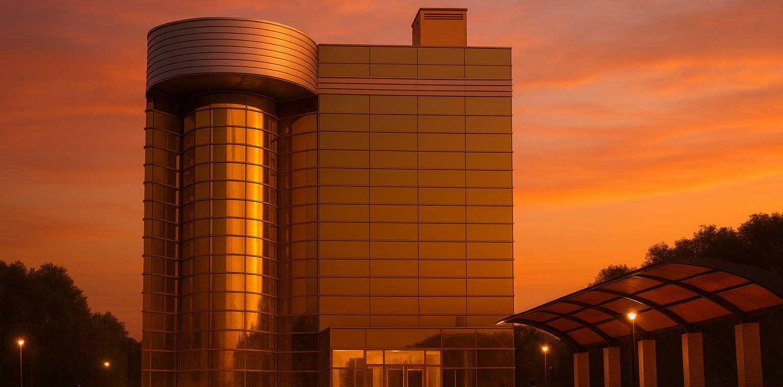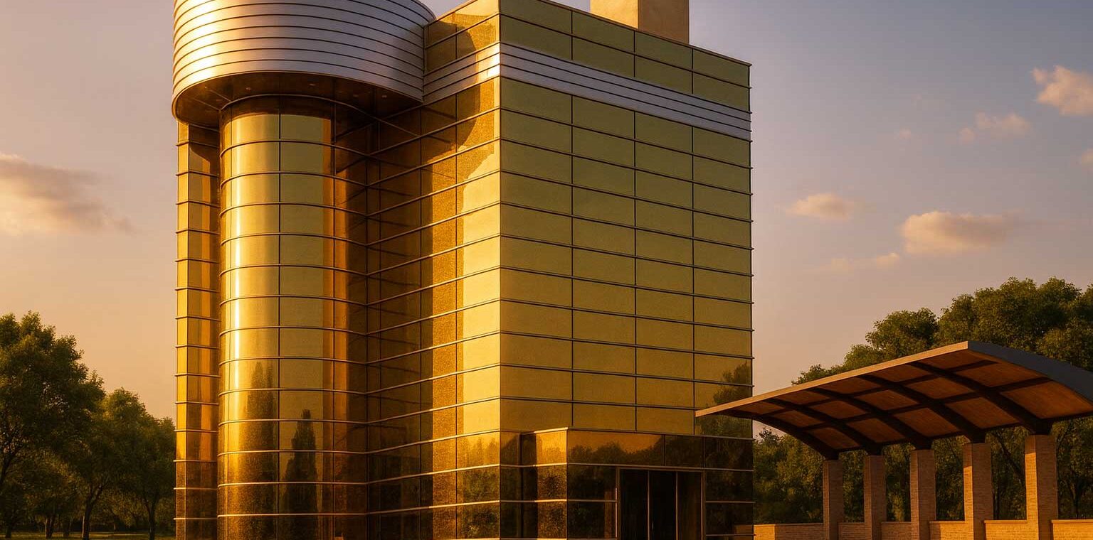 Nafisah Mall is conceived as a compact, iconic commercial hub whose architecture functions as a powerful brand statement along the main approach road. The building is expressed as a pure prism clad entirely in gold-tinted curtain-wall, with a curved glazed volume wrapping the corner to form a luminous lantern. This rounded element houses the main vertical circulation and creates a dynamic façade that reflects light throughout the day, giving the mall a strong presence even at distance. Horizontal aluminum bands at roof and mid-level emphasize the proportions while discreetly integrating façade maintenance and drainage details.