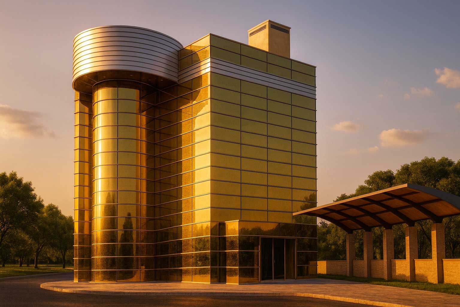Nafisah Mall is conceived as a compact, iconic commercial hub whose architecture functions as a powerful brand statement along the main approach road. The building is expressed as a pure prism clad entirely in gold-tinted curtain-wall, with a curved glazed volume wrapping the corner to form a luminous lantern. This rounded element houses the main vertical circulation and creates a dynamic façade that reflects light throughout the day, giving the mall a strong presence even at distance. Horizontal aluminum bands at roof and mid-level emphasize the proportions while discreetly integrating façade maintenance and drainage details.