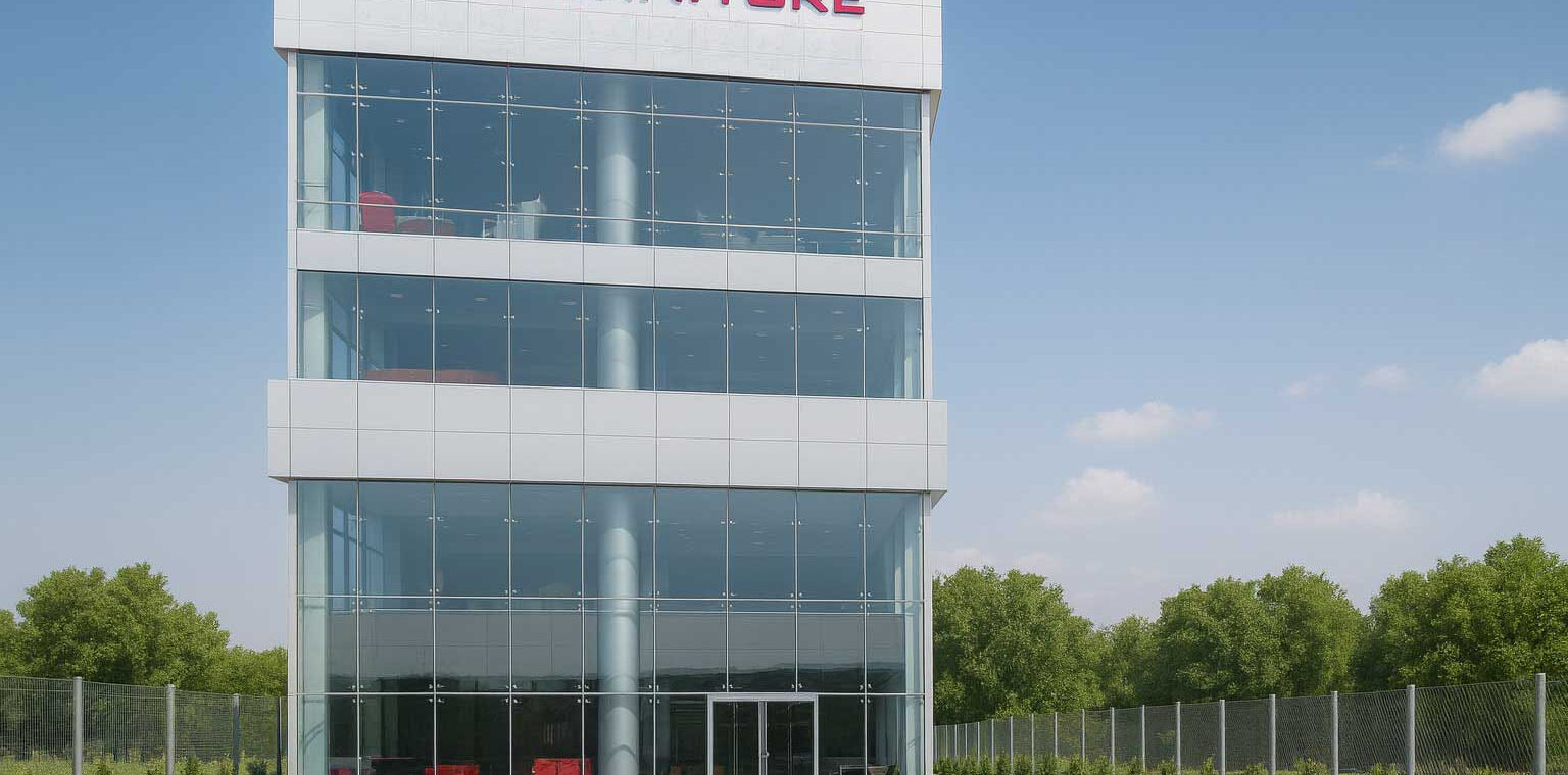 This commercial project is a compact flagship showroom and office building designed to give the furniture brand maximum visibility with a simple, iconic form. The four-storey volume is expressed as a clean glass box framed by lightweight aluminum composite cladding, creating a contemporary façade that reads clearly from the highway and surrounding approaches. Full-height curtain-wall glazing on all sides showcases the interior displays and creates a strong visual connection between the furniture collections and the exterior public realm.