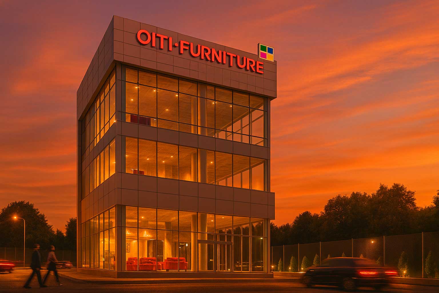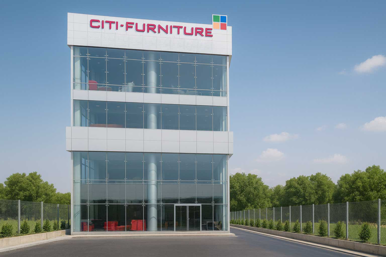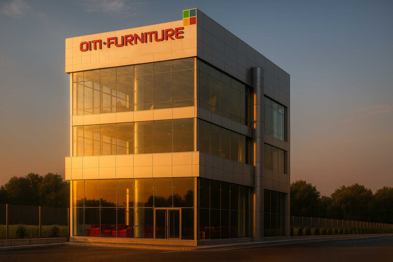 This commercial project is a compact flagship showroom and office building designed to give the furniture brand maximum visibility with a simple, iconic form. The four-storey volume is expressed as a clean glass box framed by lightweight aluminum composite cladding, creating a contemporary façade that reads clearly from the highway and surrounding approaches. Full-height curtain-wall glazing on all sides showcases the interior displays and creates a strong visual connection between the furniture collections and the exterior public realm.