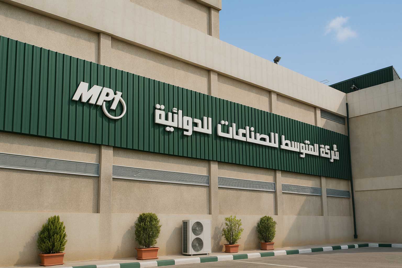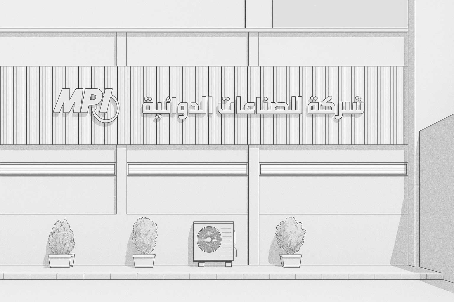 MPI Factory is a specialized pharmaceutical production campus designed to meet stringent GMP and hygiene requirements within a robust, low-maintenance envelope. The architecture is intentionally simple and clean: solid sand-colored walls articulated by recessed vertical and horizontal joints, combined with a continuous green metal cladding band that carries the corporate identity and Arabic signage. This clear, readable façade conceals a highly controlled internal environment, where production, packaging, and storage zones are each served by dedicated HVAC and filtration systems.