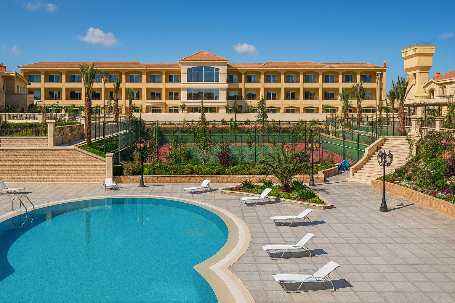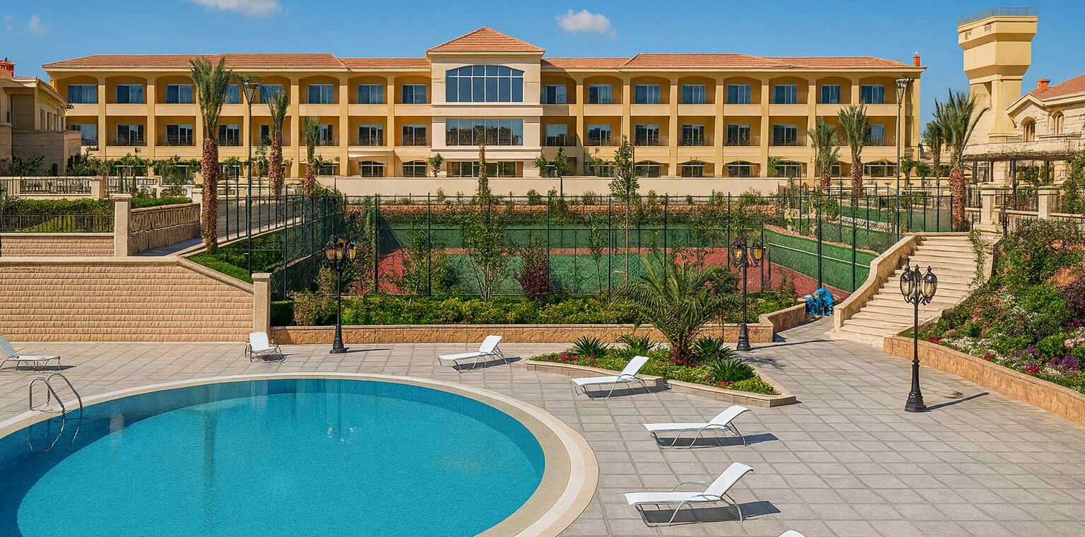 Palm Village Resort is a high-end residential resort composed of standalone villas set within a terraced landscape. This villa is positioned on an elevated platform, giving wide panoramic views over the surrounding gardens and internal roads. The architecture combines warm stone cladding, pitched tiled roofs, and large horizontal windows to create bright interior spaces with strong visual connection to the outdoors. The split-level arrangement allows direct access from the main living floor to generous terraces, while a lower garden level accommodates recreation or guest spaces with independent entry.